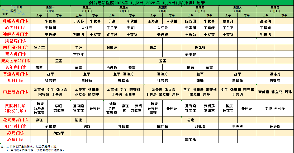 烟台芝罘医院(含毓璜顶专家)门诊排班计划表(2025年10月27日-2025年11月9日)