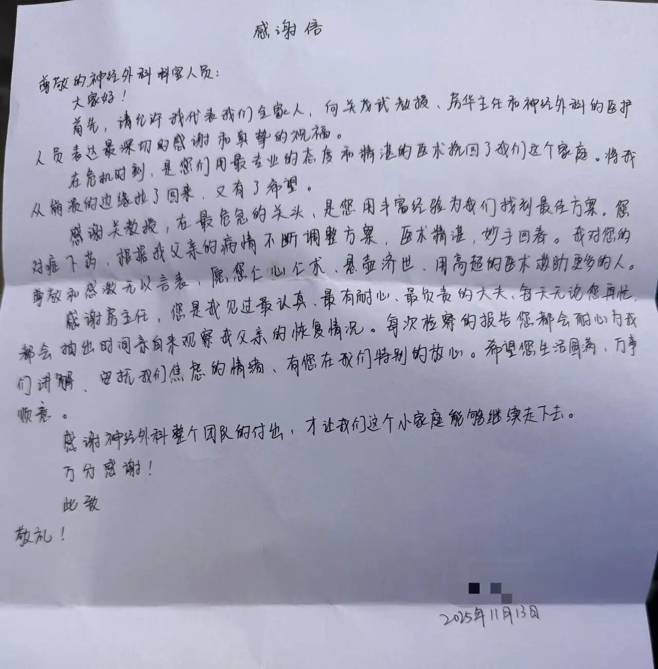 近日,芝罘医院神经外科的医护人员带着复杂而释然的心情,共同拆开了一封患者家属二十多天前送来的感谢信。之所以迟拆,是因为信送来时,信中的那位患者,正因重型颅脑损伤挣扎在生死线上,病情瞬息万变。这封信,与那份沉甸甸的责任,一同压在每位参与救治者的心头。直到近日,患者一天天好转的消息不断传来,大家才终于能怀着激动与慰藉的心情,回顾这场惊心动魄的生命保卫战。