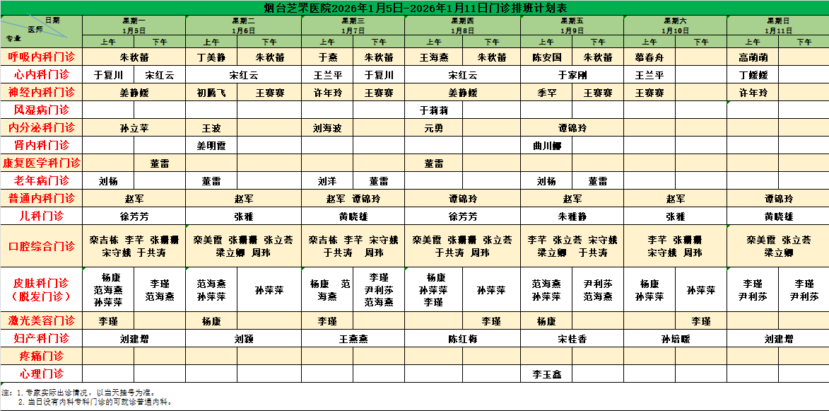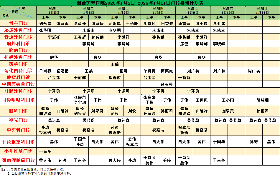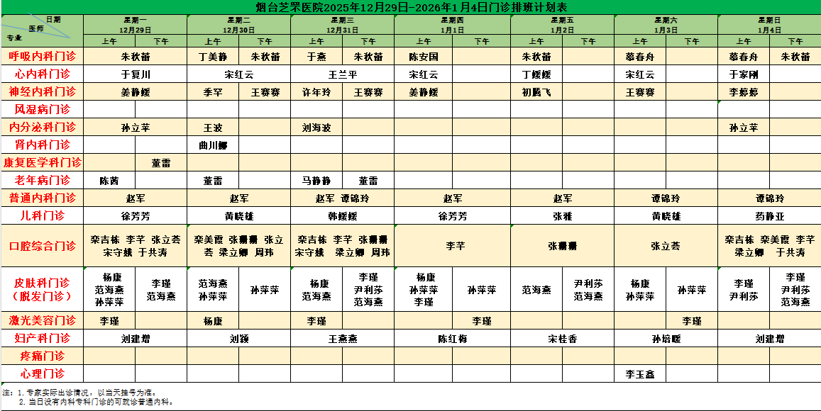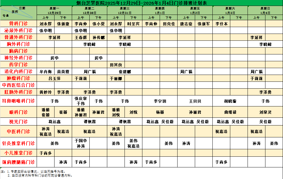 烟台芝罘医院(含毓璜顶专家)门诊排班计划表(2025年12月29日-2026年1月11日)