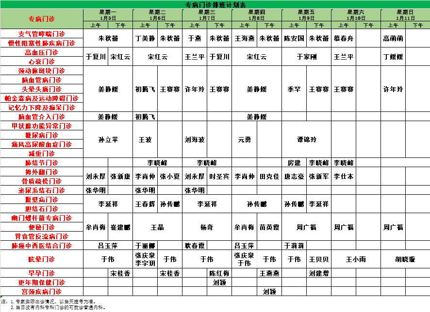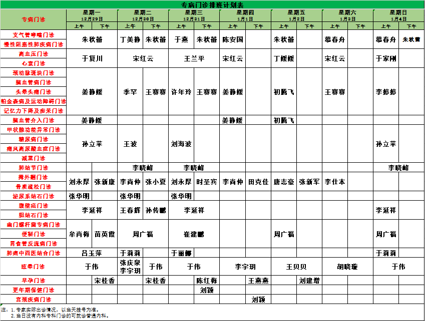 2025年12月29日-2026年1月11日门诊专家值班计划表如下: