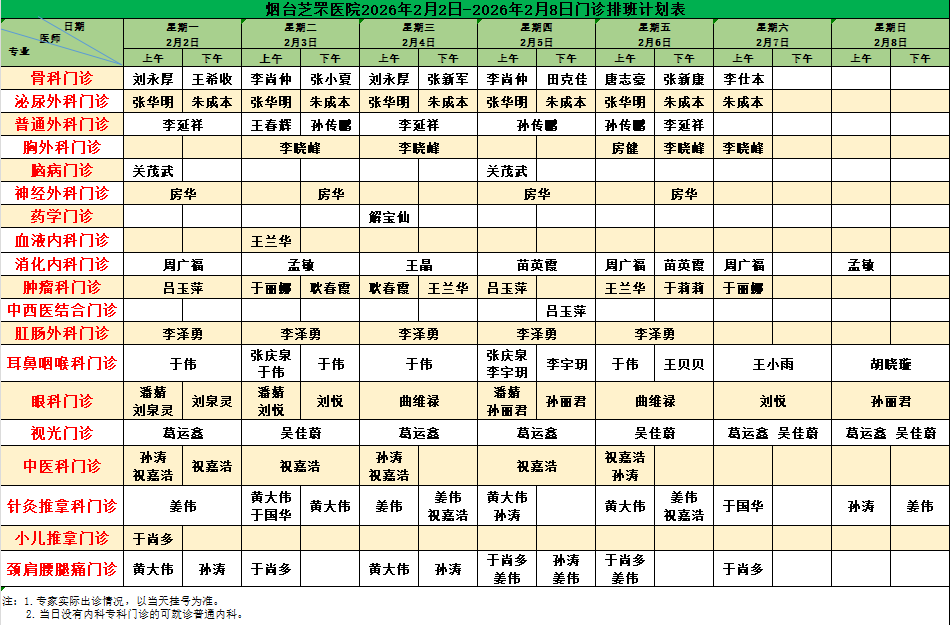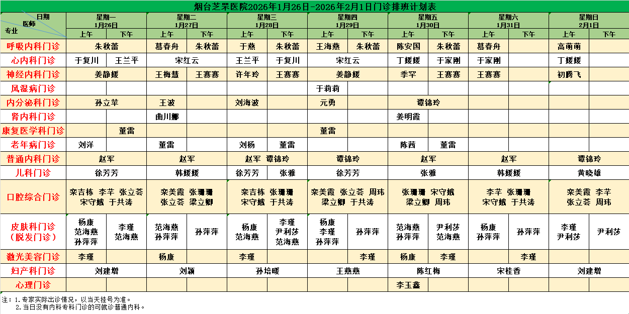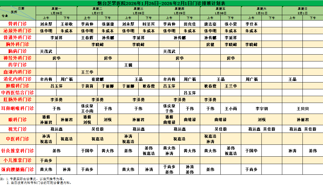 烟台芝罘医院(含毓璜顶专家)门诊排班计划表(2026年1月26日-2026年2月8日)