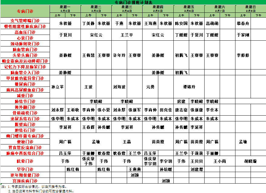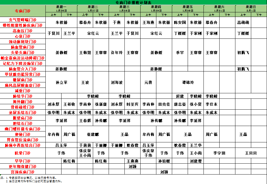 2026年1月26日-2026年2月8日门诊专家值班计划表如下: