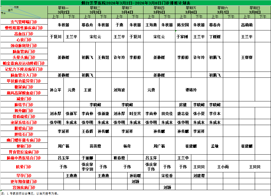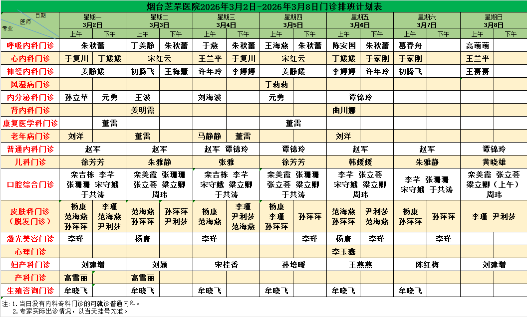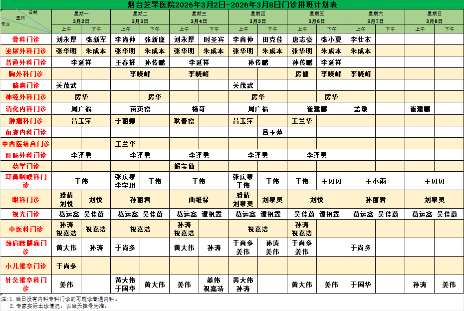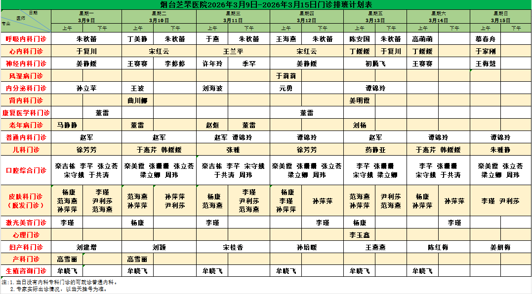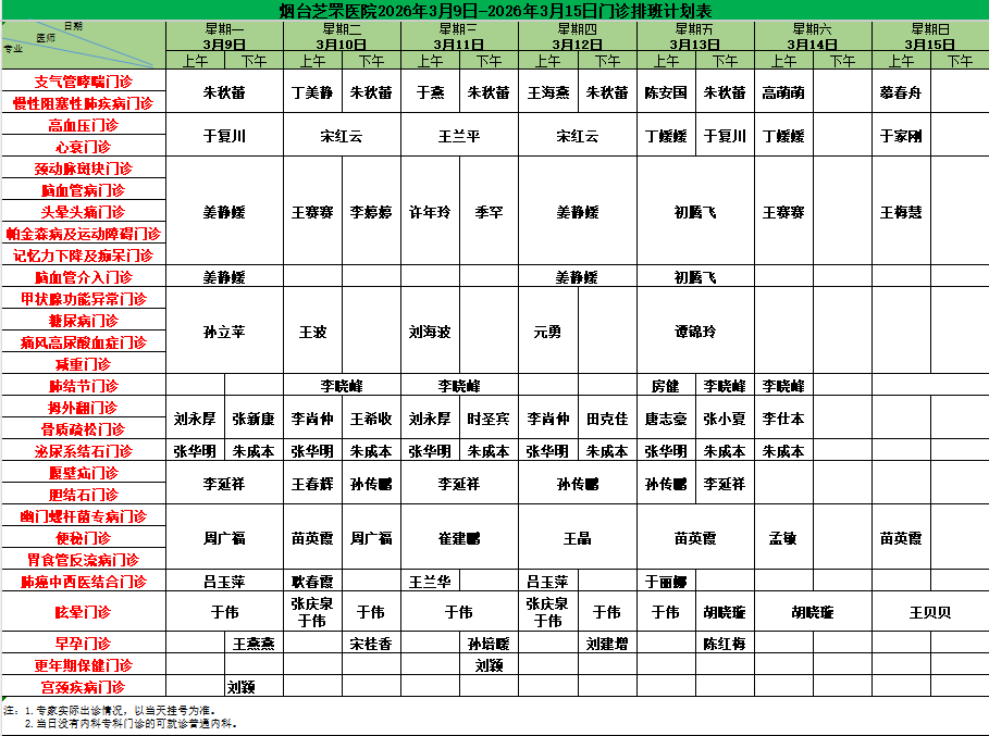 烟台芝罘医院(含毓璜顶专家)门诊排班计划表(2026年3月2日-2026年3月15日)
